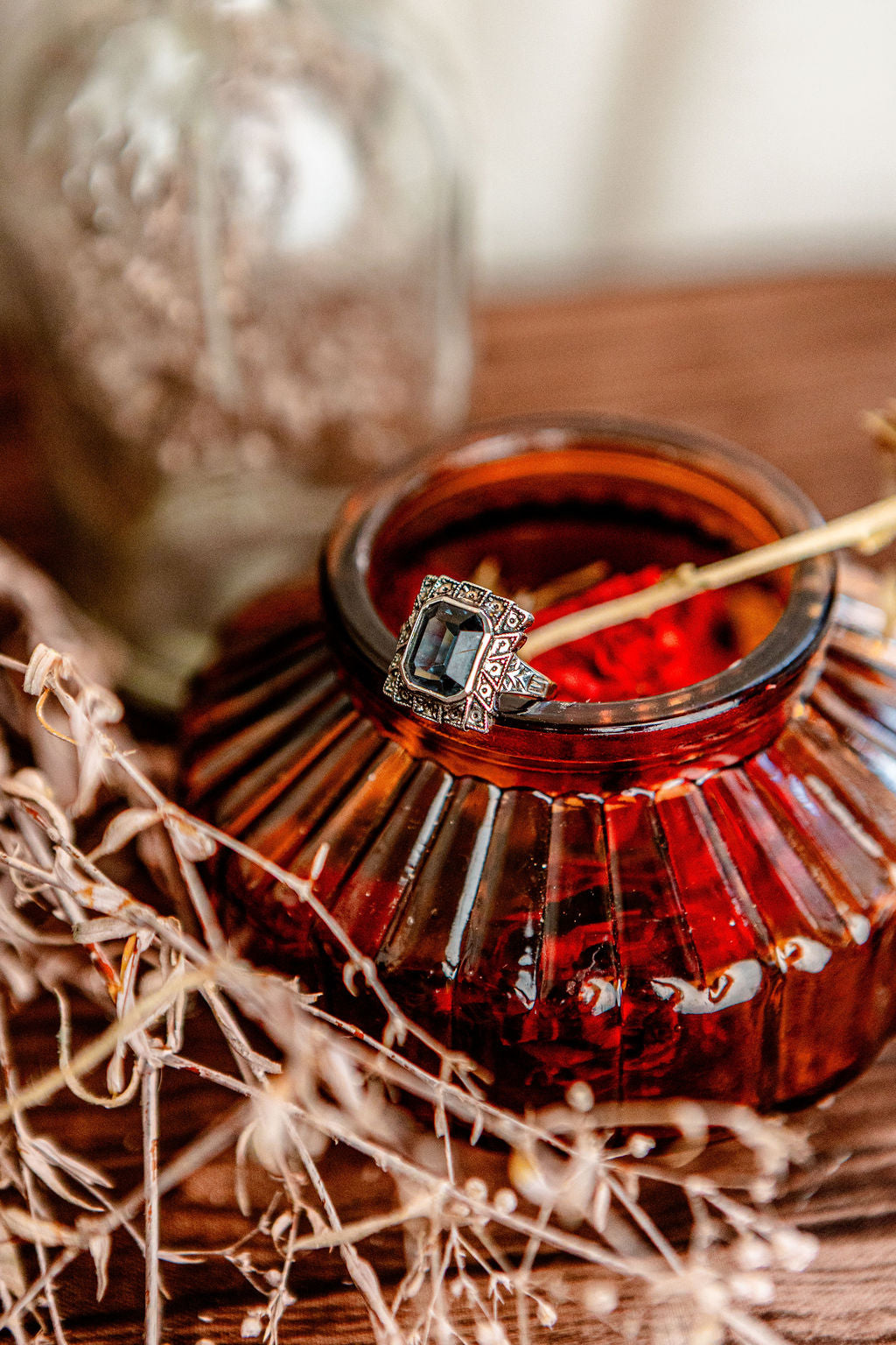 An antique ring featuring a light-blue glass stone, framed by sparkling marcasite accents. Set in a finely detailed silver-toned mount, this piece reflects classic early 20th-century styling with elegant geometric lines.