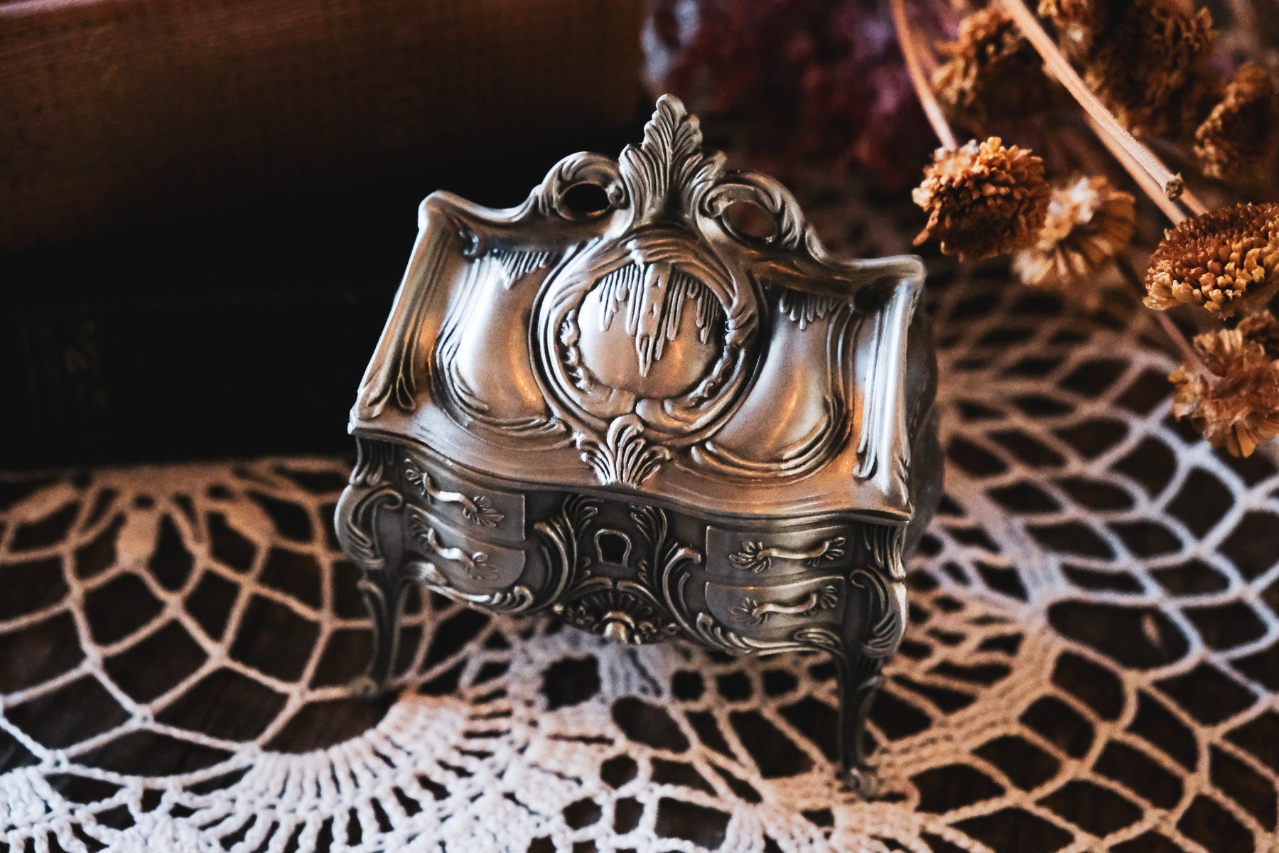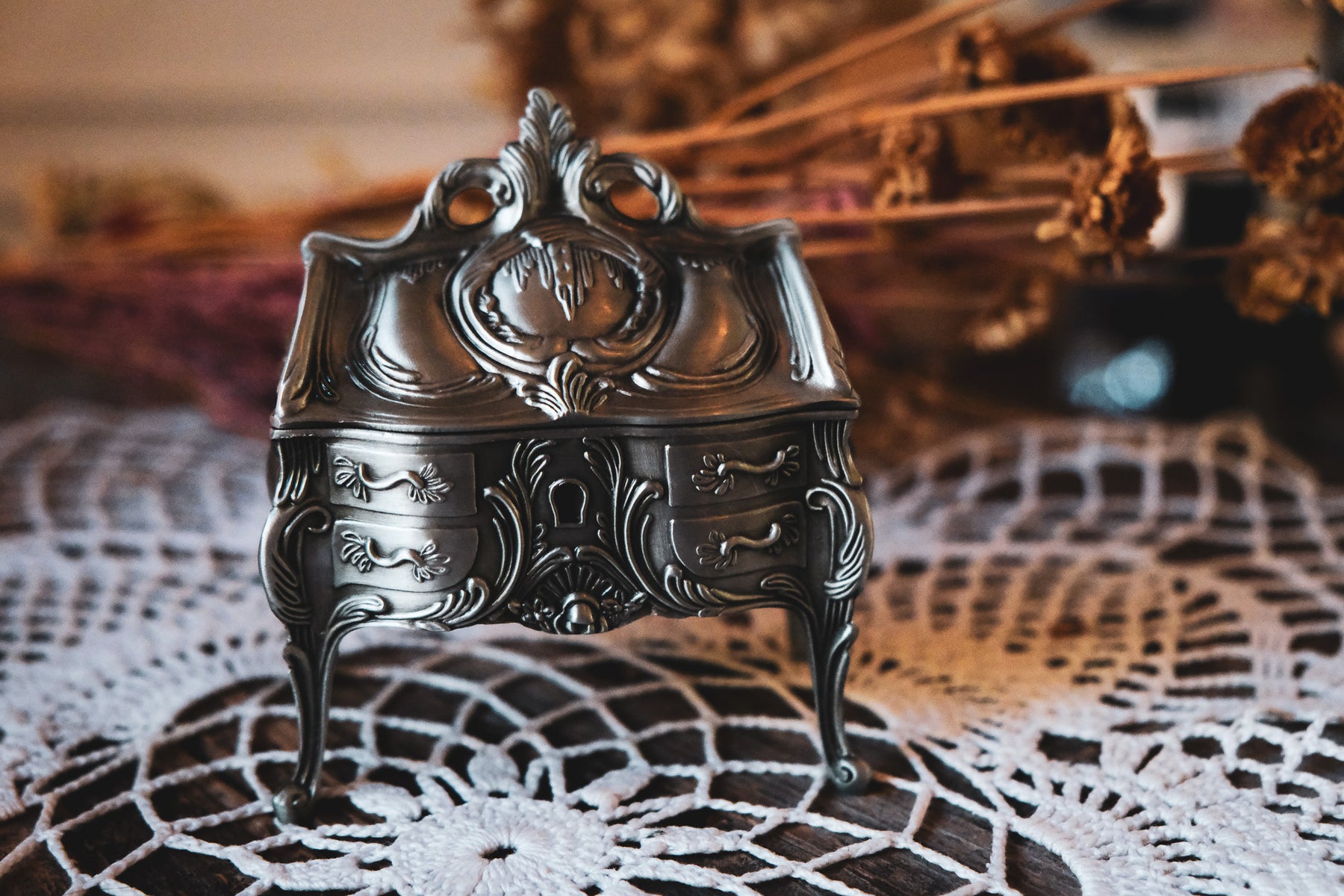 Step into the past with our Vintage-Inspired Jewelry Box. Store your jewelry, your enchanted keepsakes, or your secret notes in this felt lined trinket box.