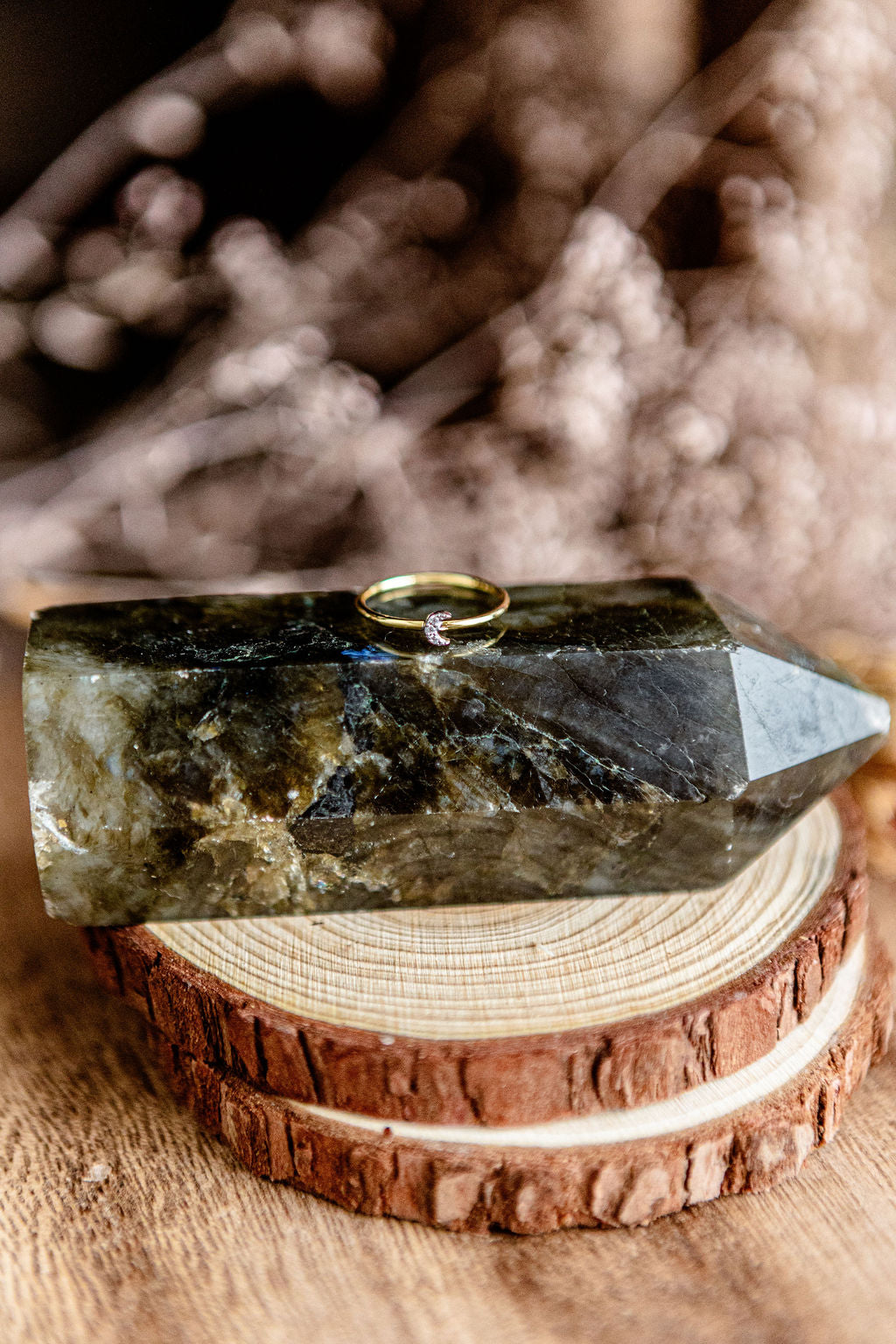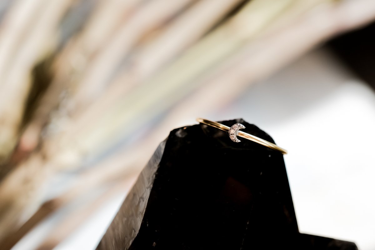 This 14k gold ring has the daintiest of crescent moons made of pave diamonds. Its delicate size makes it the perfect stacking or midi ring.